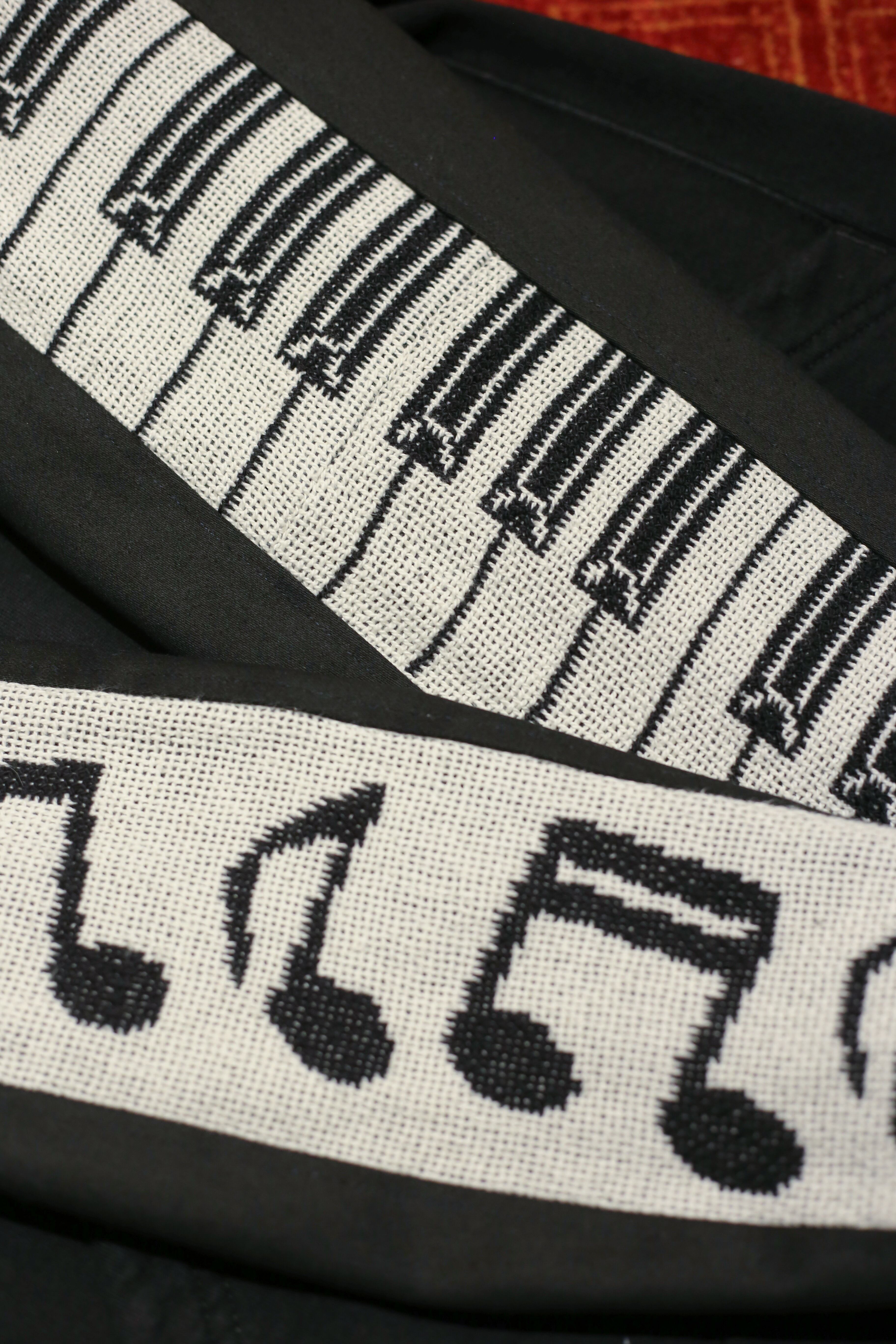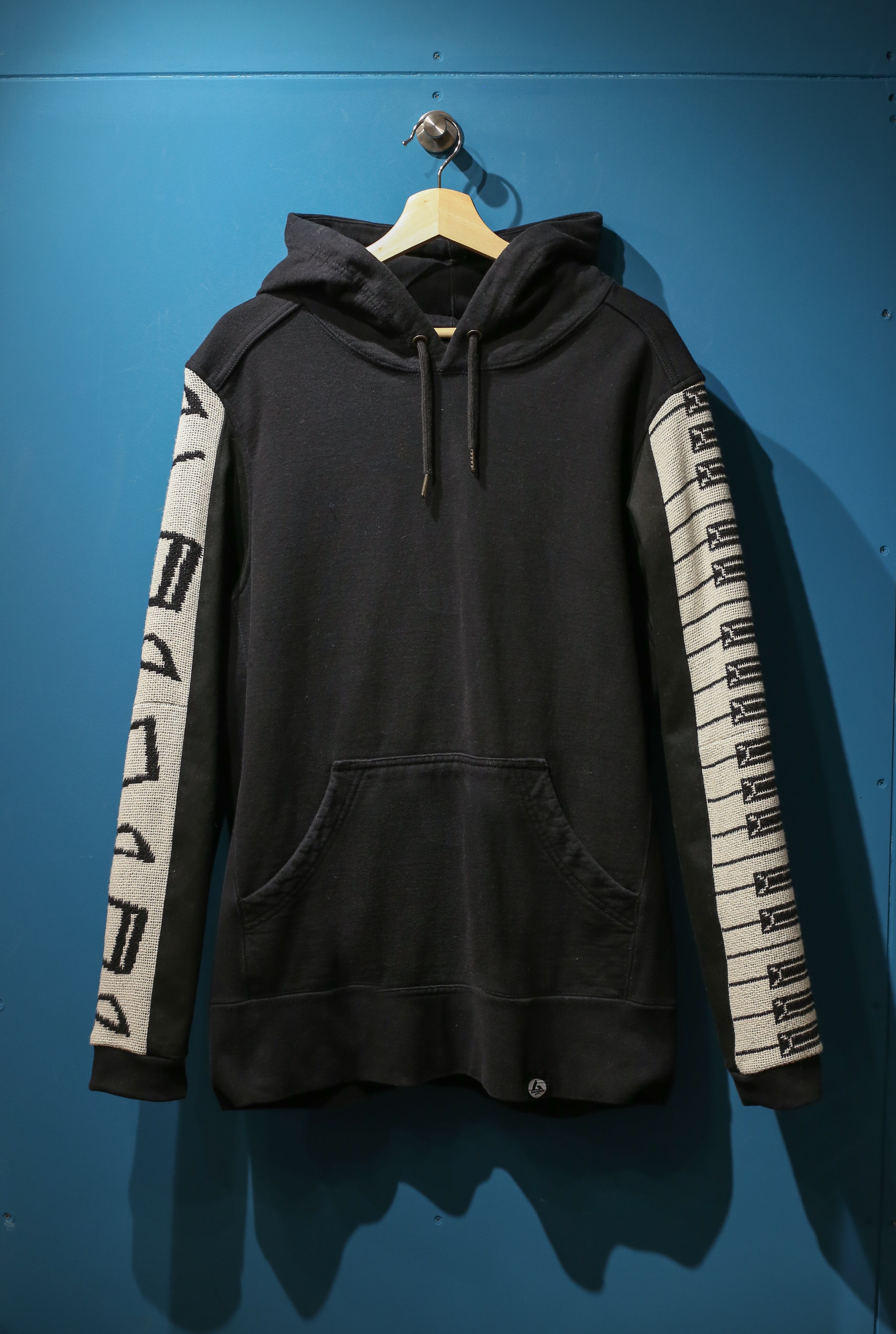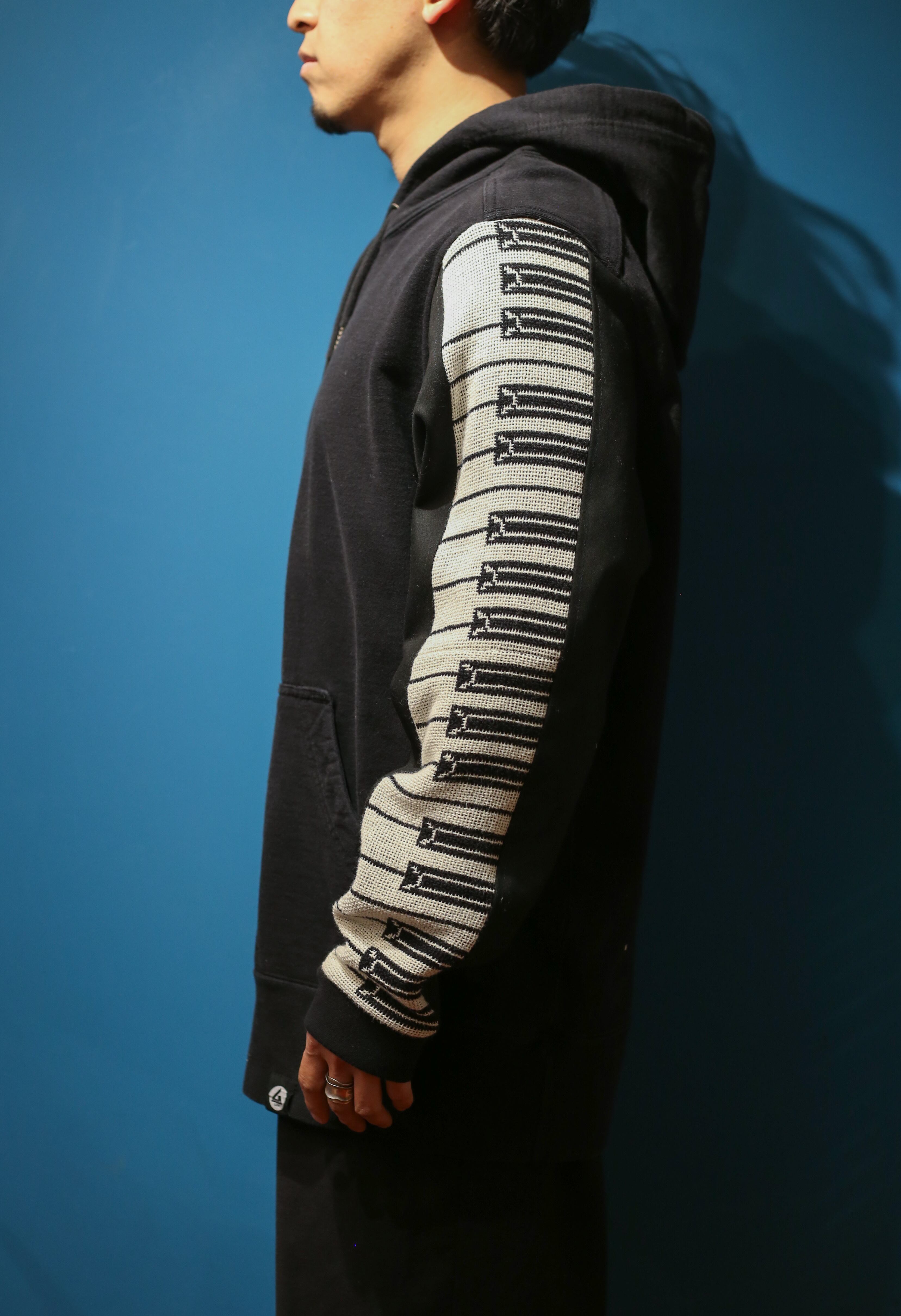 USA製のコットンスウェットをボディに、両袖のサイドにラグで鍵盤と音符を差し込みました。ラグ以外の部分の袖はブラックデニムになっています。