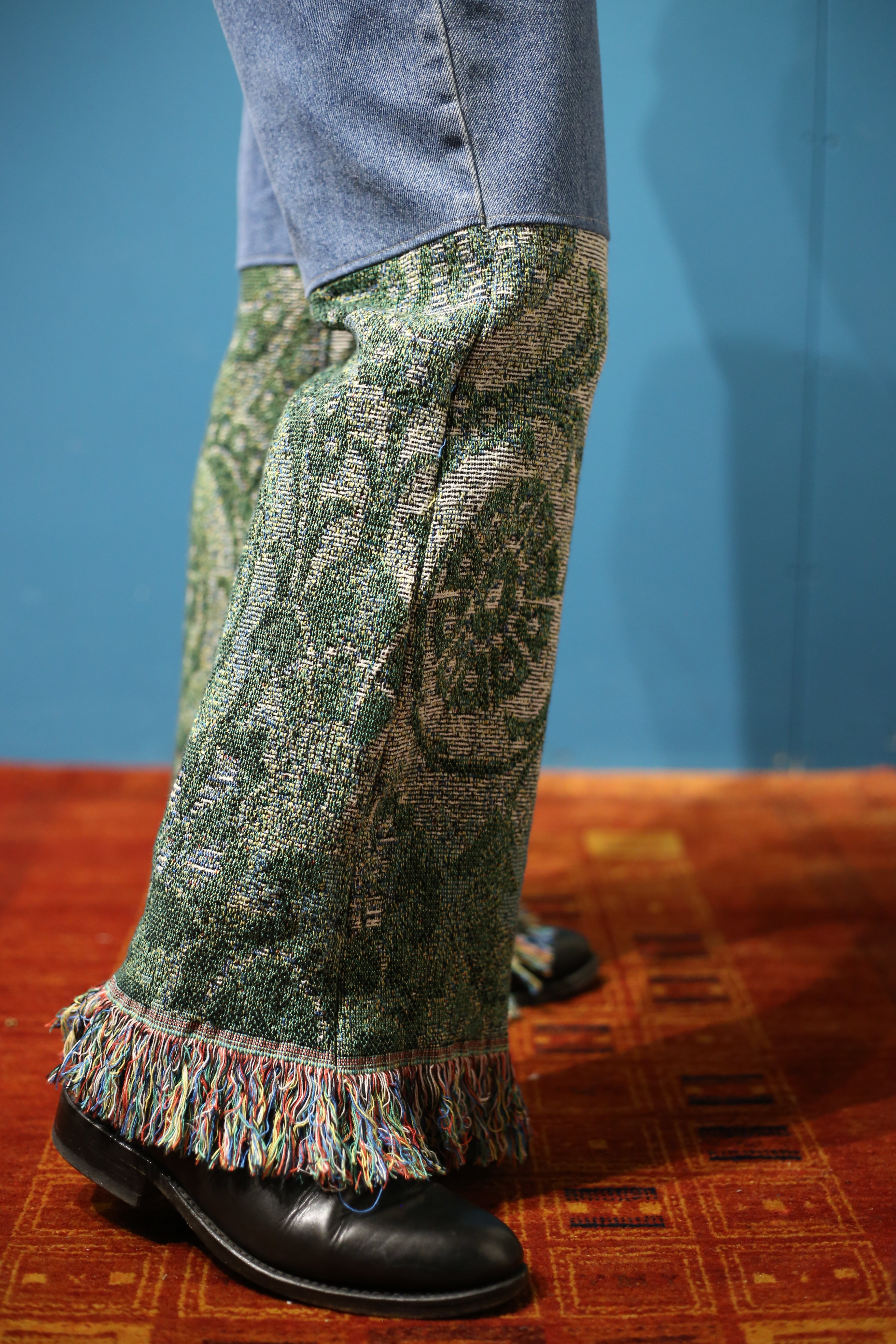 ワイドなブルーデニムを膝下からコットンラグに切り替えたリメイクデニムです。