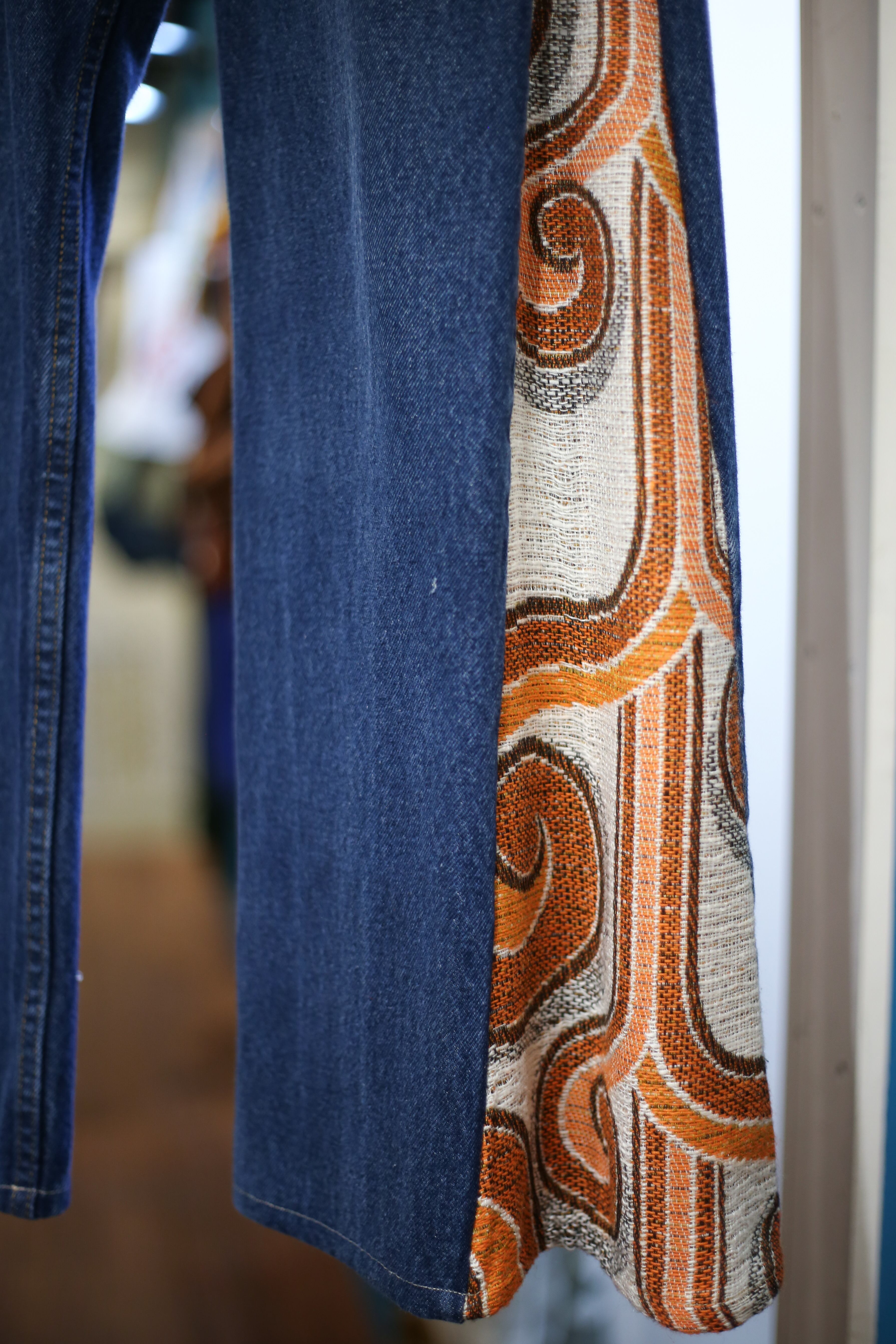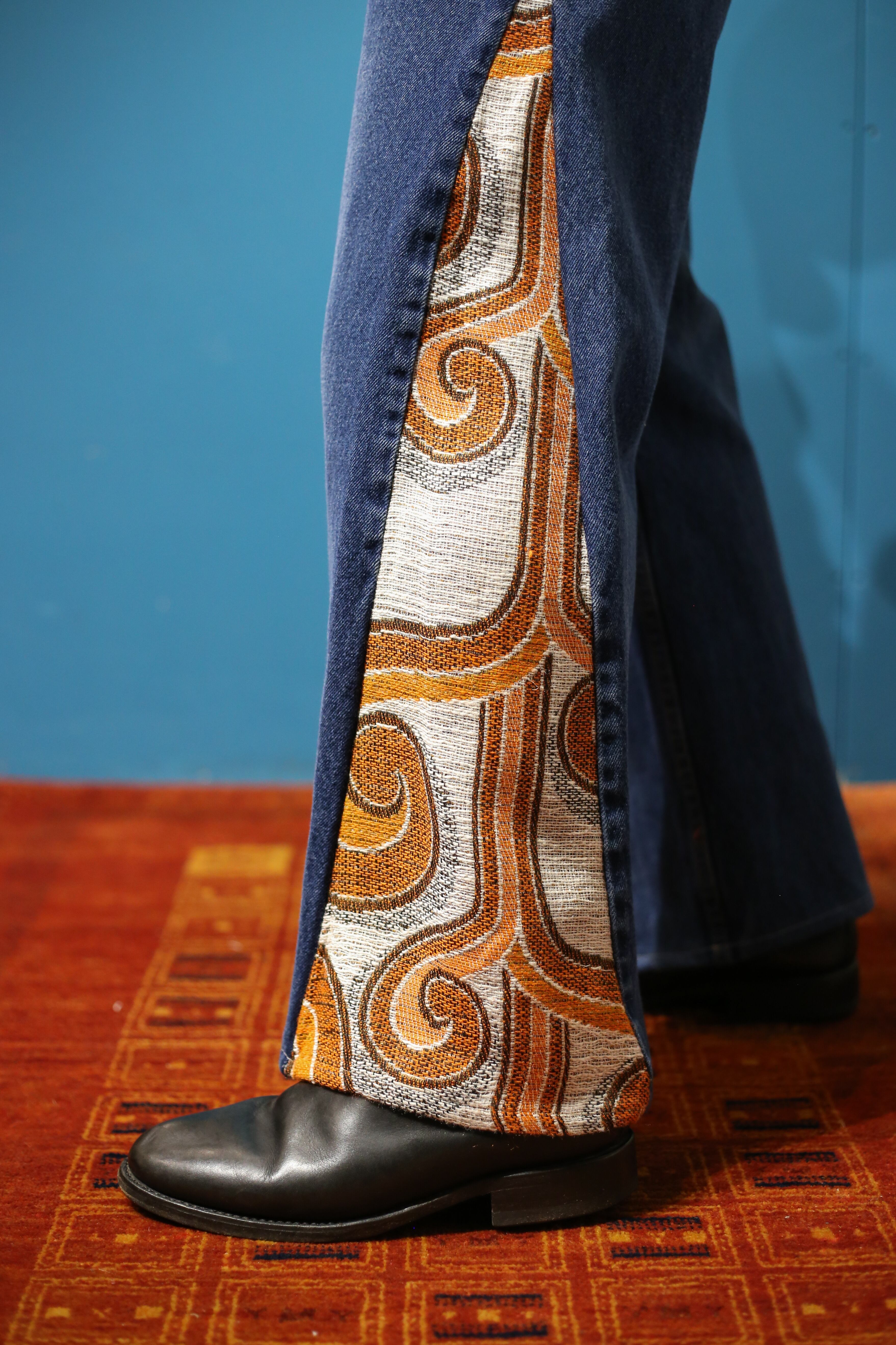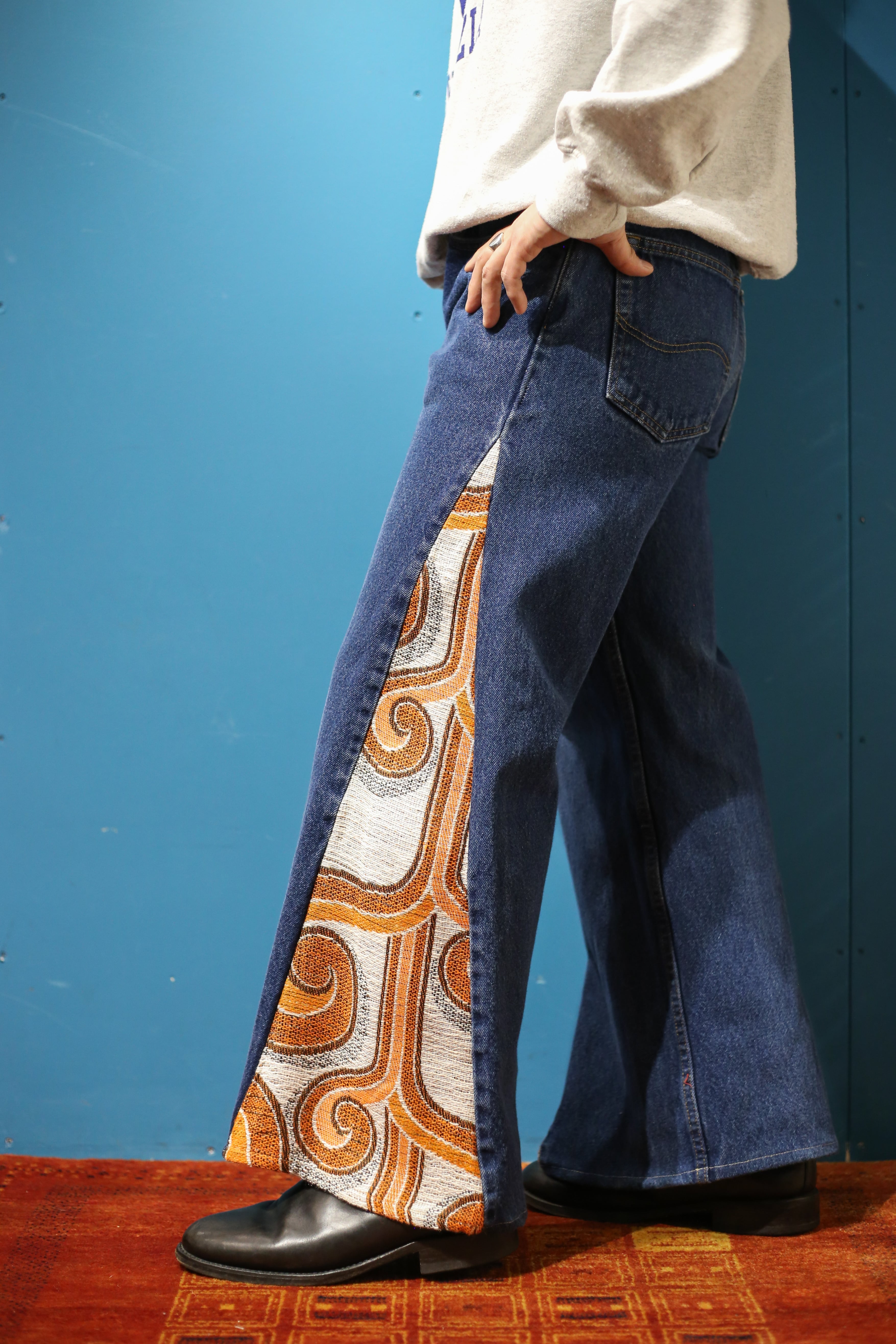 Leeのブルーデニムをベースに70’sのビンテージカーテンを合わせたリメイクデニム。