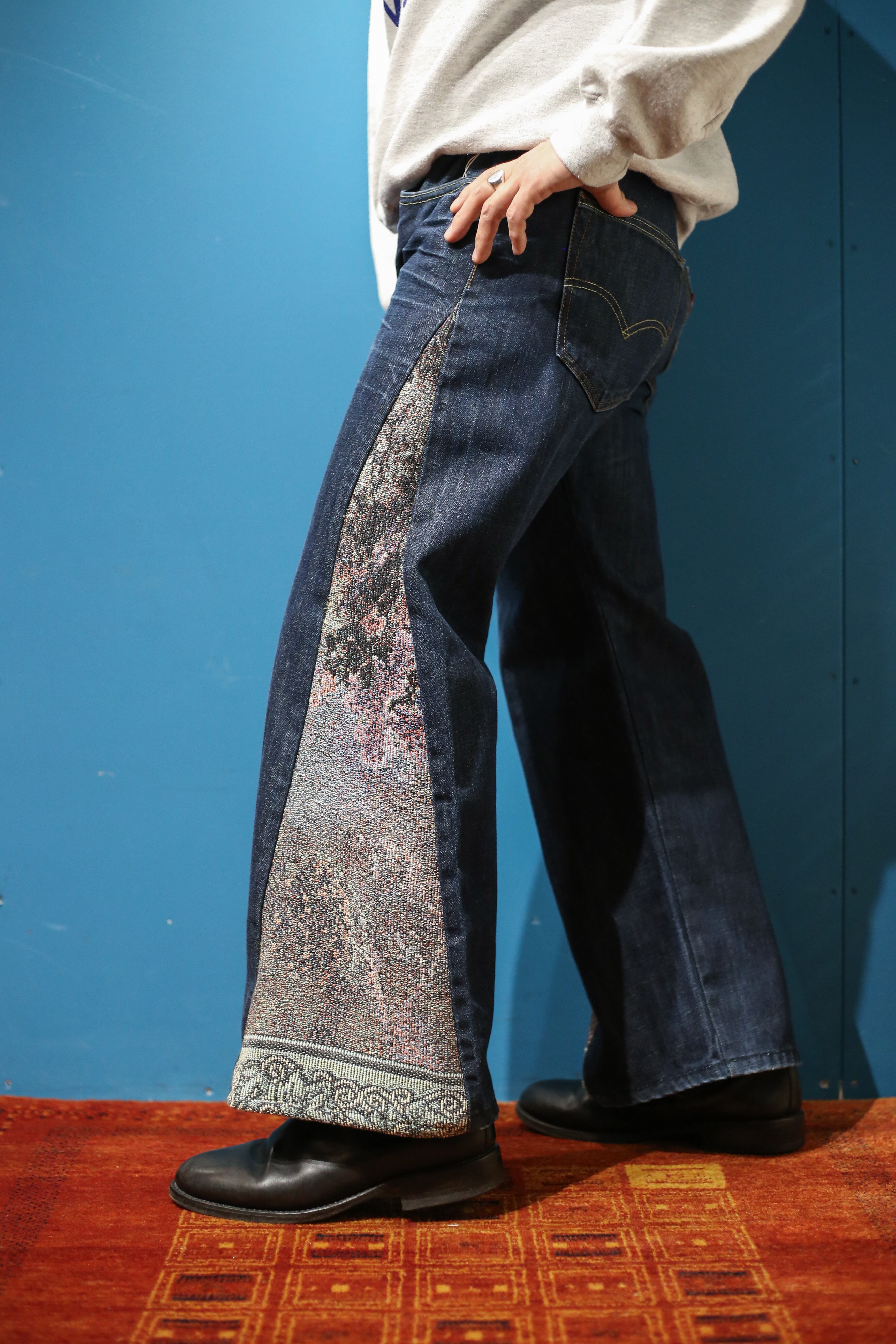 濃紺のLevi’s 501デニムに、同系色のボタニカルモチーフのコットンラグを合わせました。色味は近いですが質感の違う合わせが面白いかと。