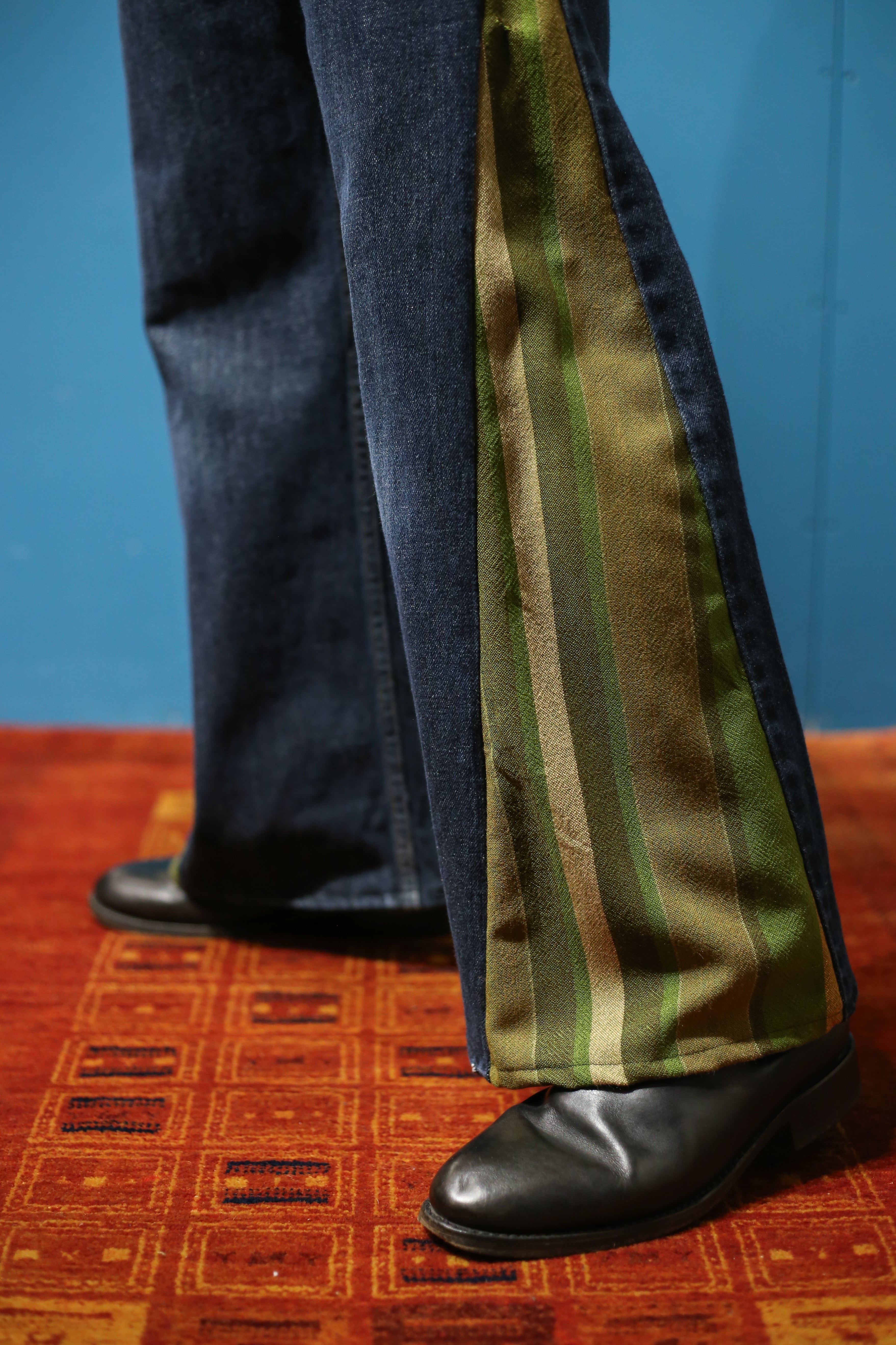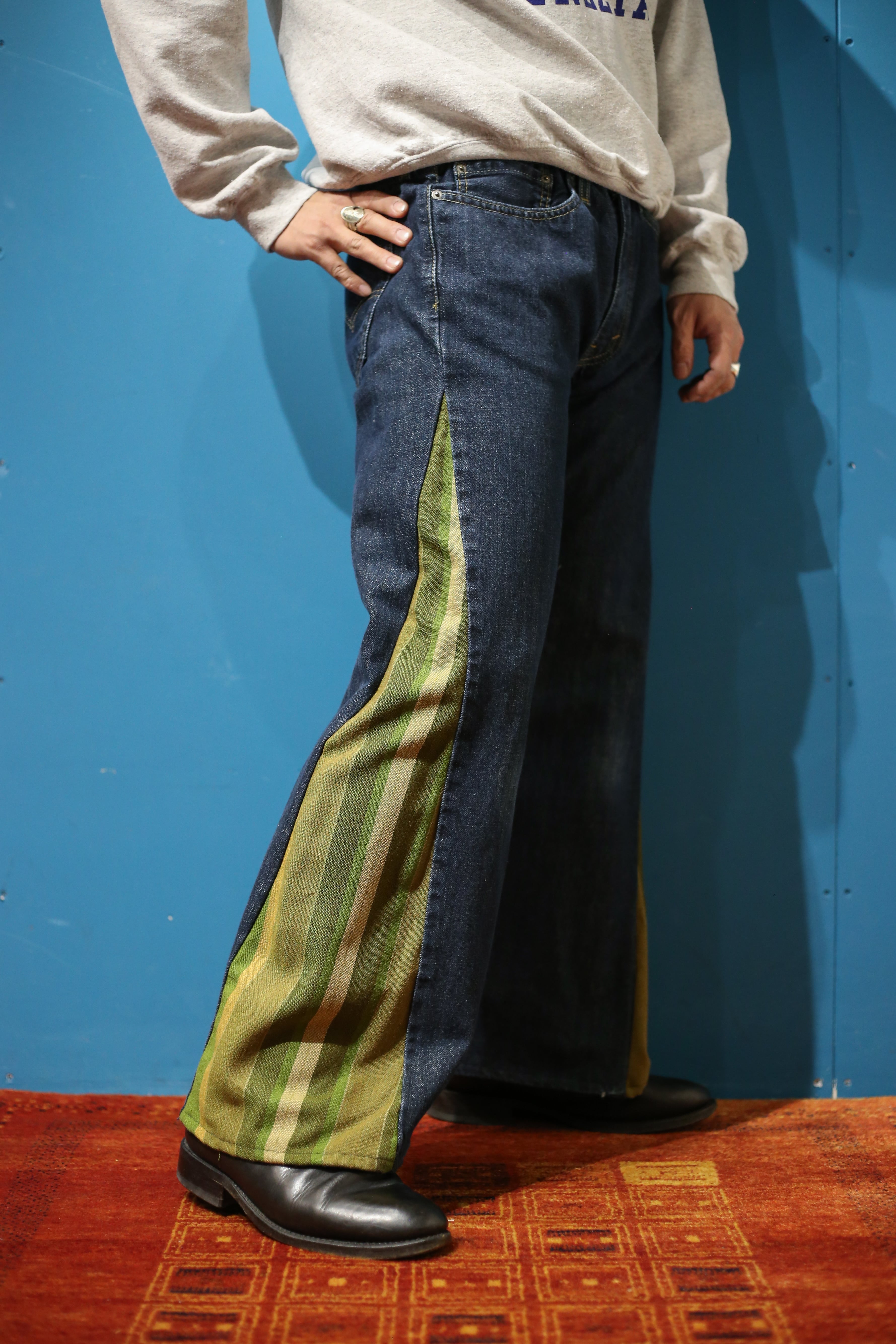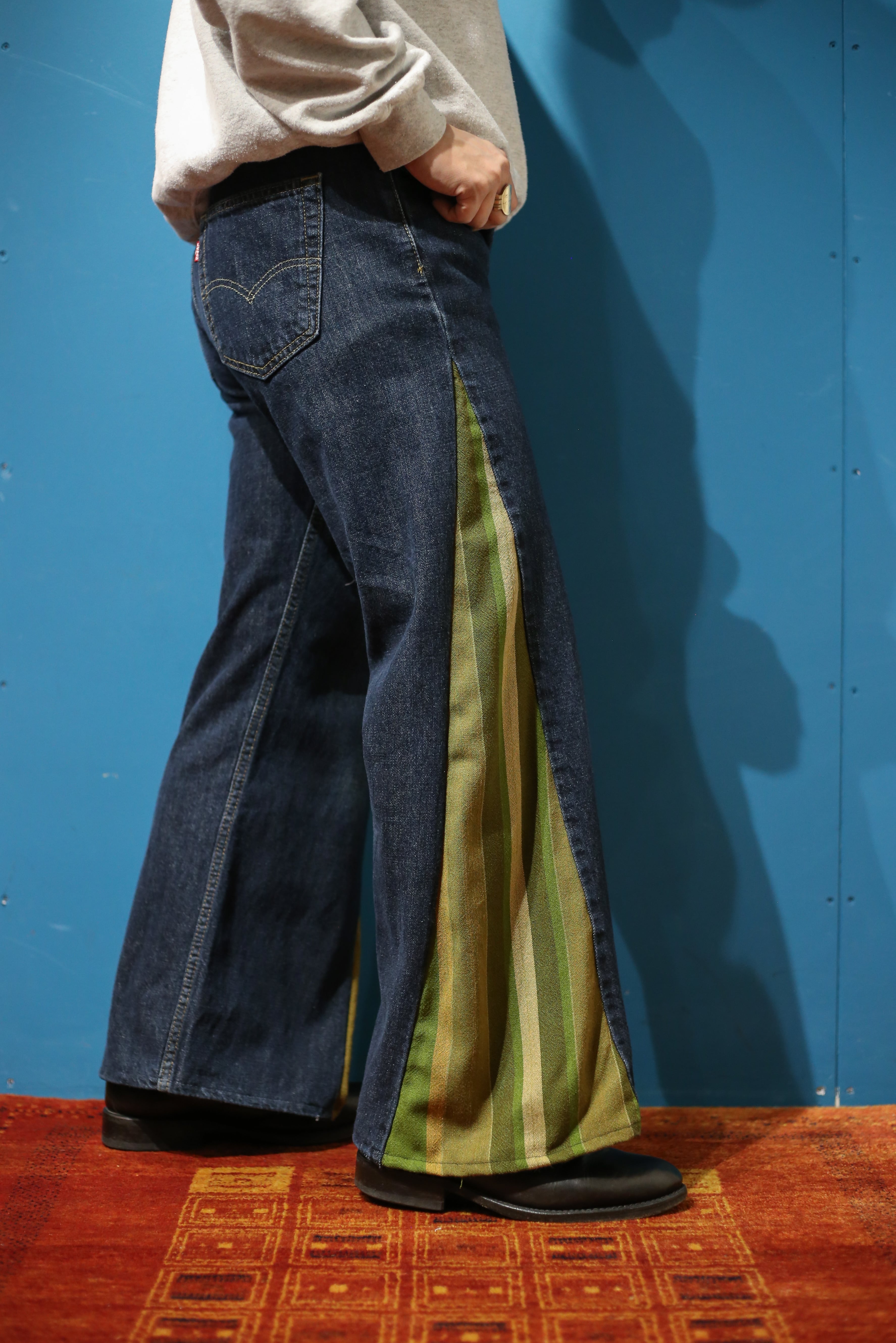 濃紺のLevi’s 517デニムに、グリーンなどのストライプ柄なイギリス軍のベッドシーツを合わせました。