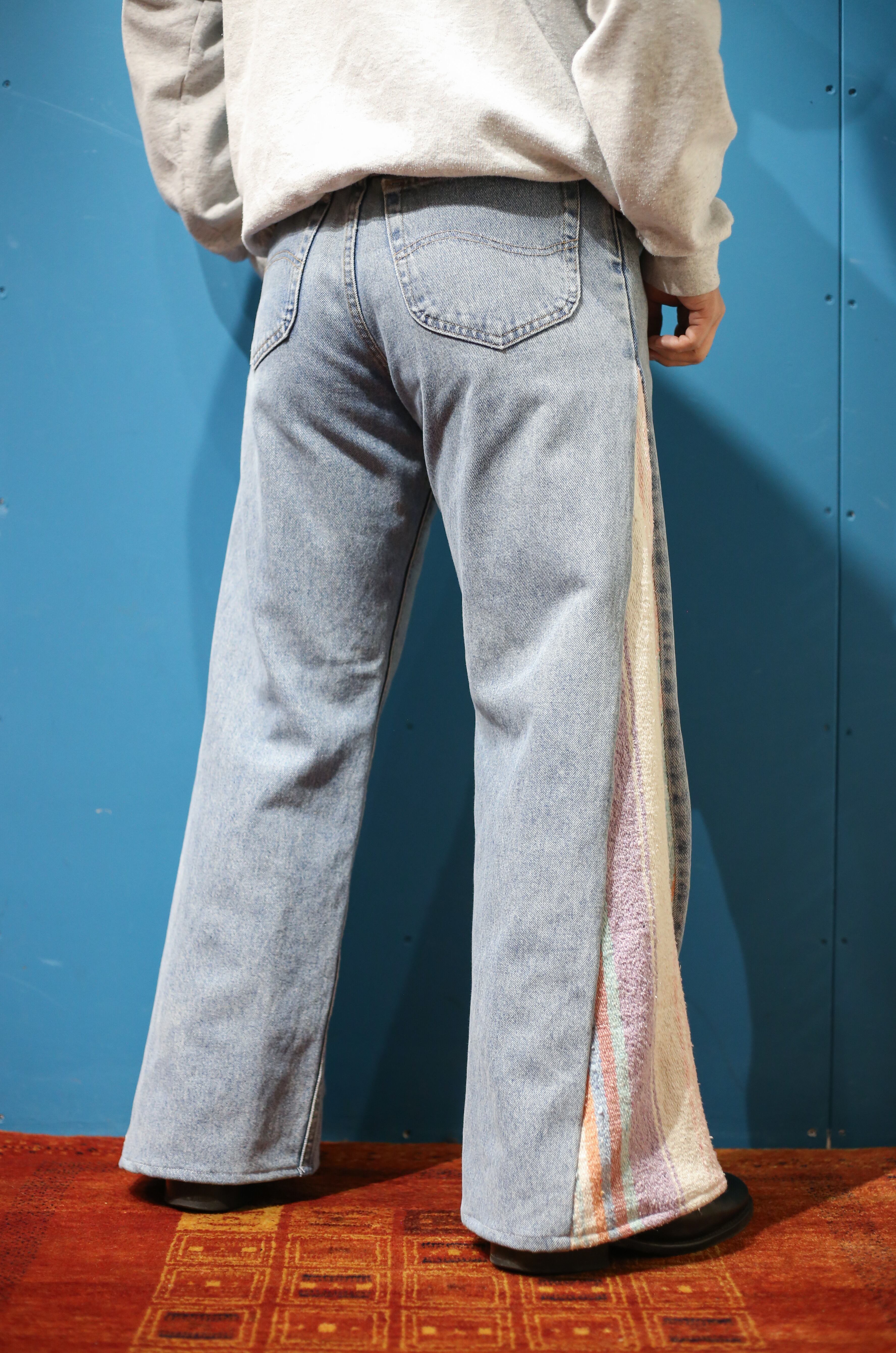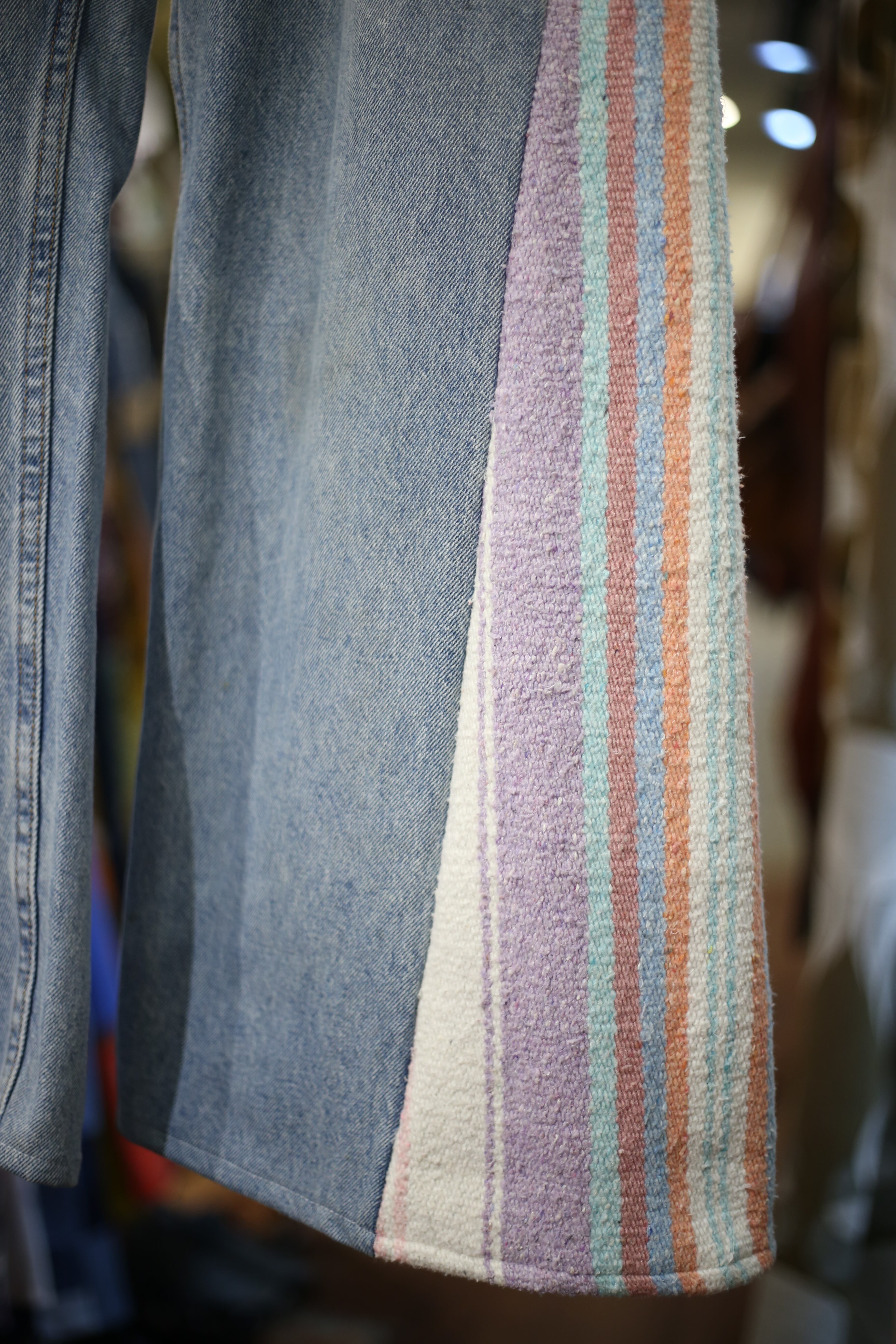 Leeの色褪せたライトブルーのデニムに、淡いペールトーンのメキシカンラグを合わせました。