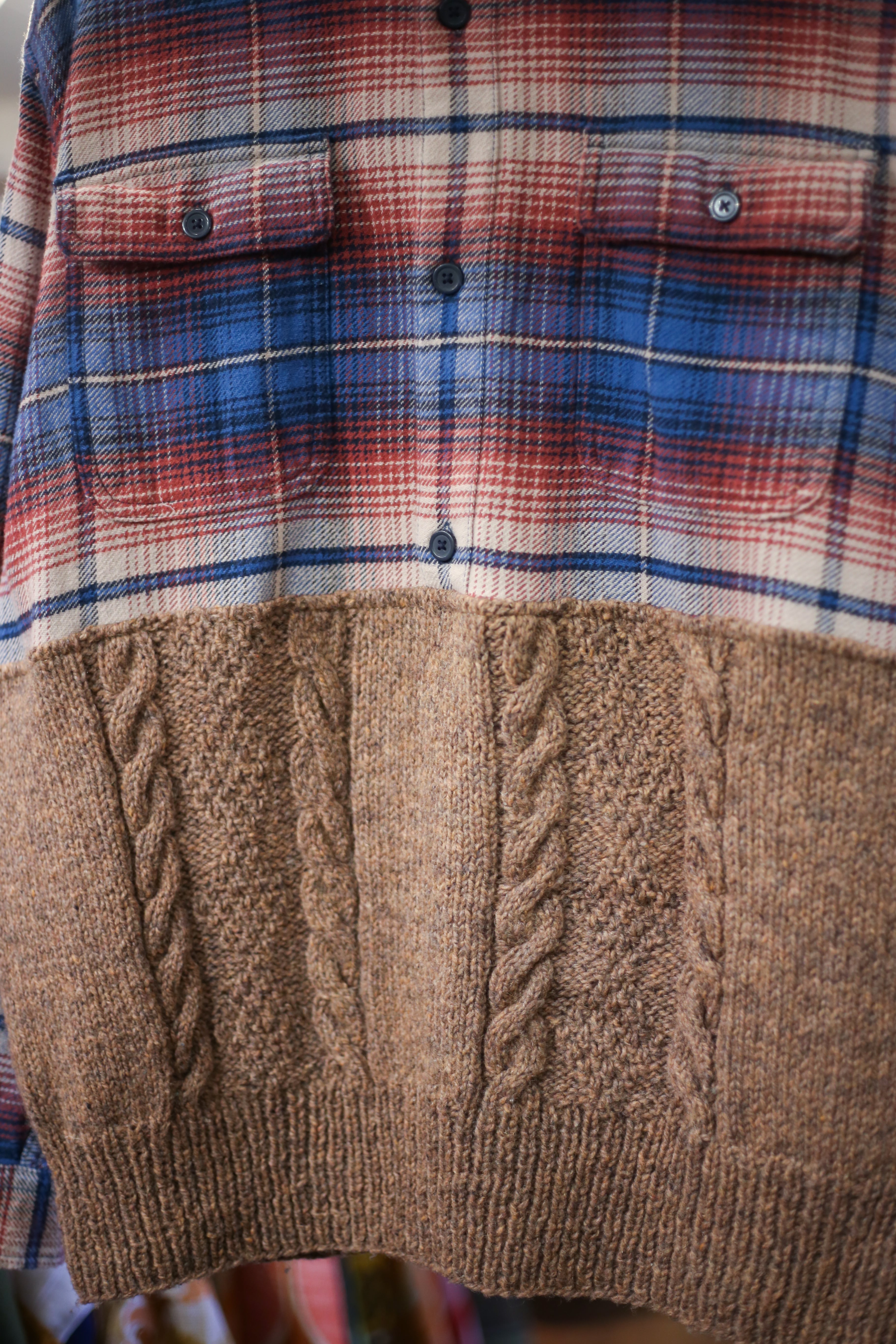ピンクに近いようなテラコッタ色のようなケーブルニットと、ブルー×ピンクのチェックネルシャツを半々で繋ぎ合わせました。