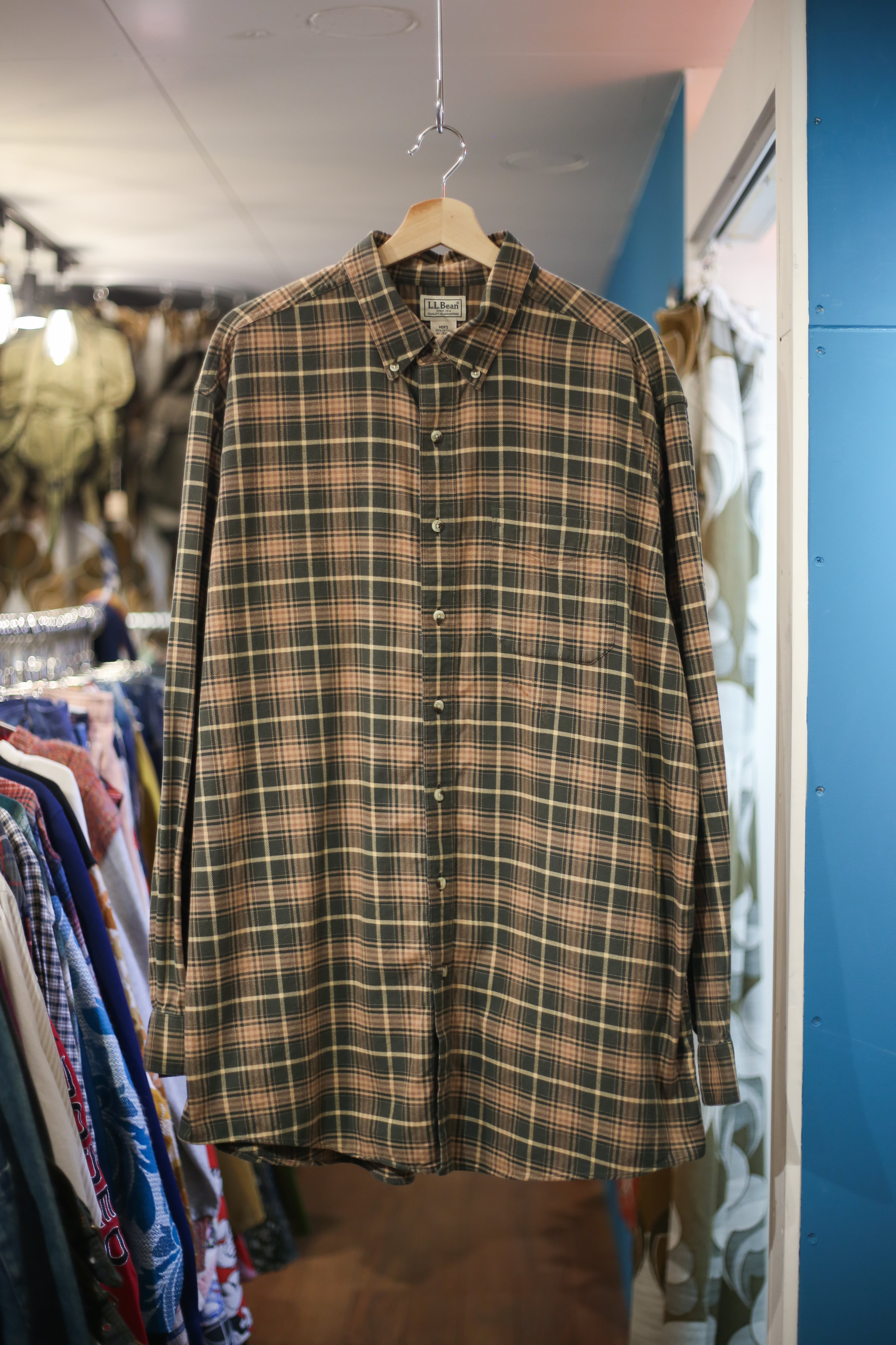 アウトドアな雰囲気のカラーリングな L.LBeanのチェックシャツ カラーリングのくすんだ感じが 良い雰囲気を醸し出しています 着丈:88cm 肩幅:54cm 身幅:66cm 袖丈:67cm Fabric: cotton Size: XL ※撮影環境により写真と実際の色が若干異なる場合がございます。 ※こちらの商品は古着になります。古着の特性をご了承頂いた上でご購入下さいませ。