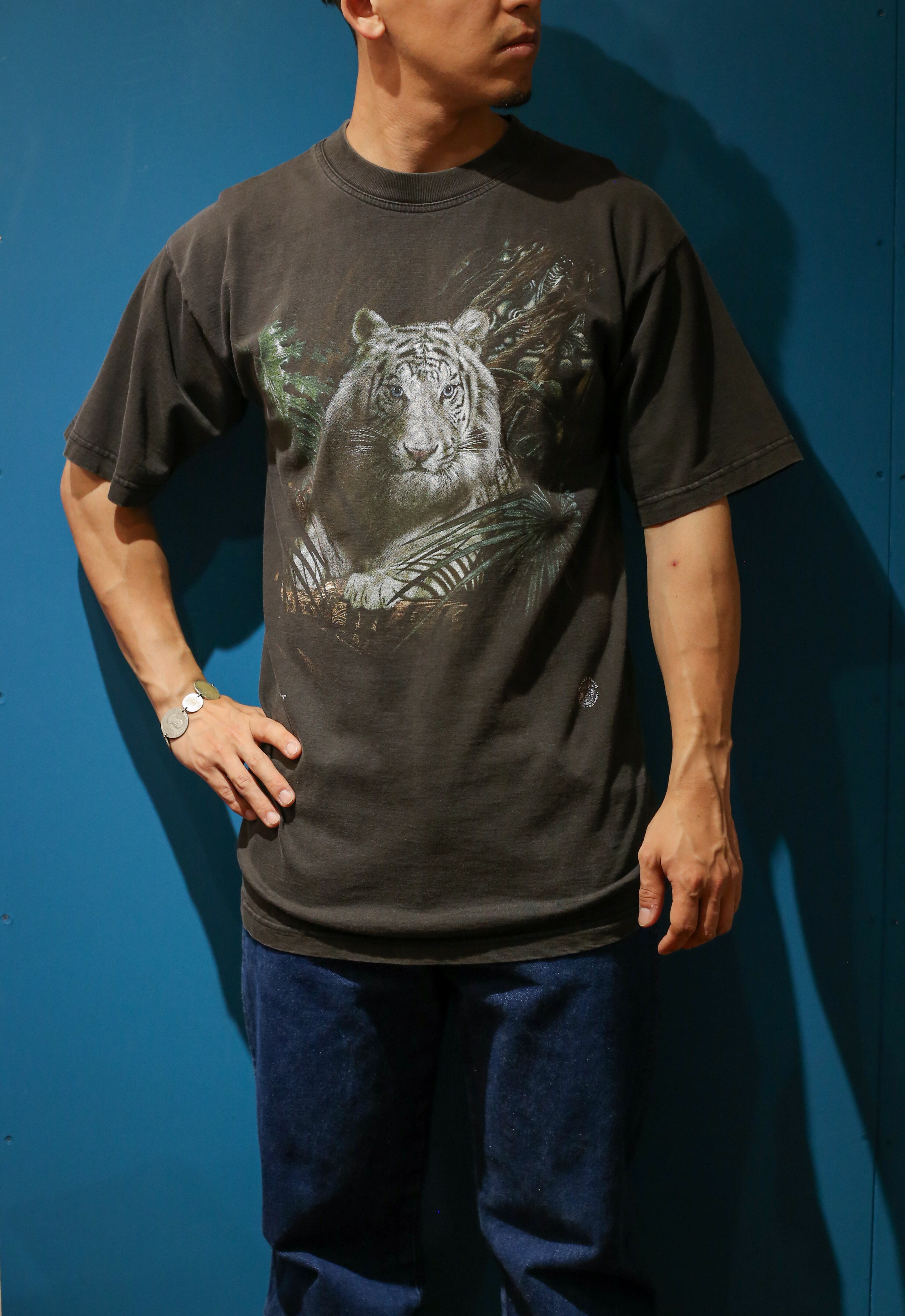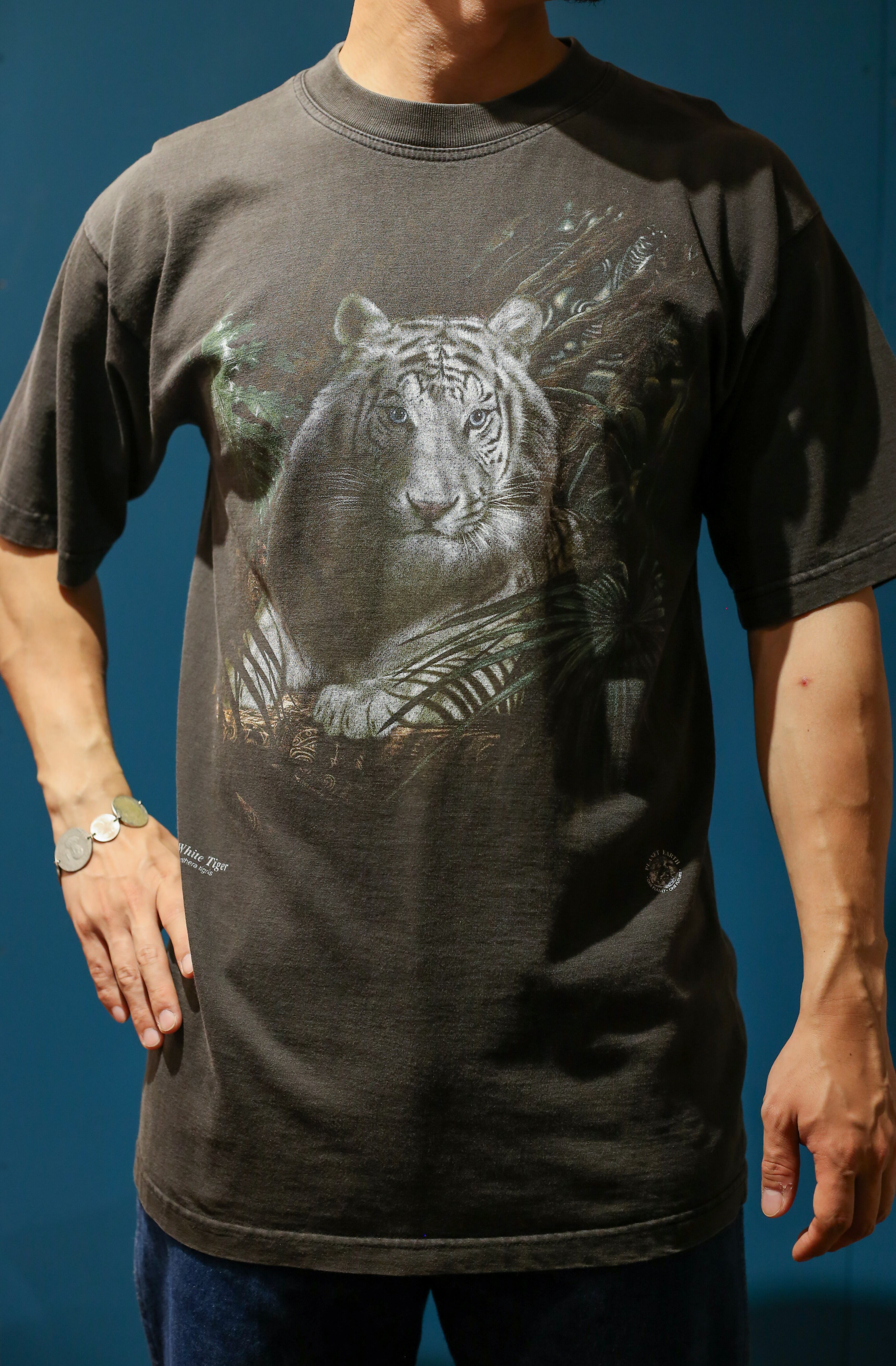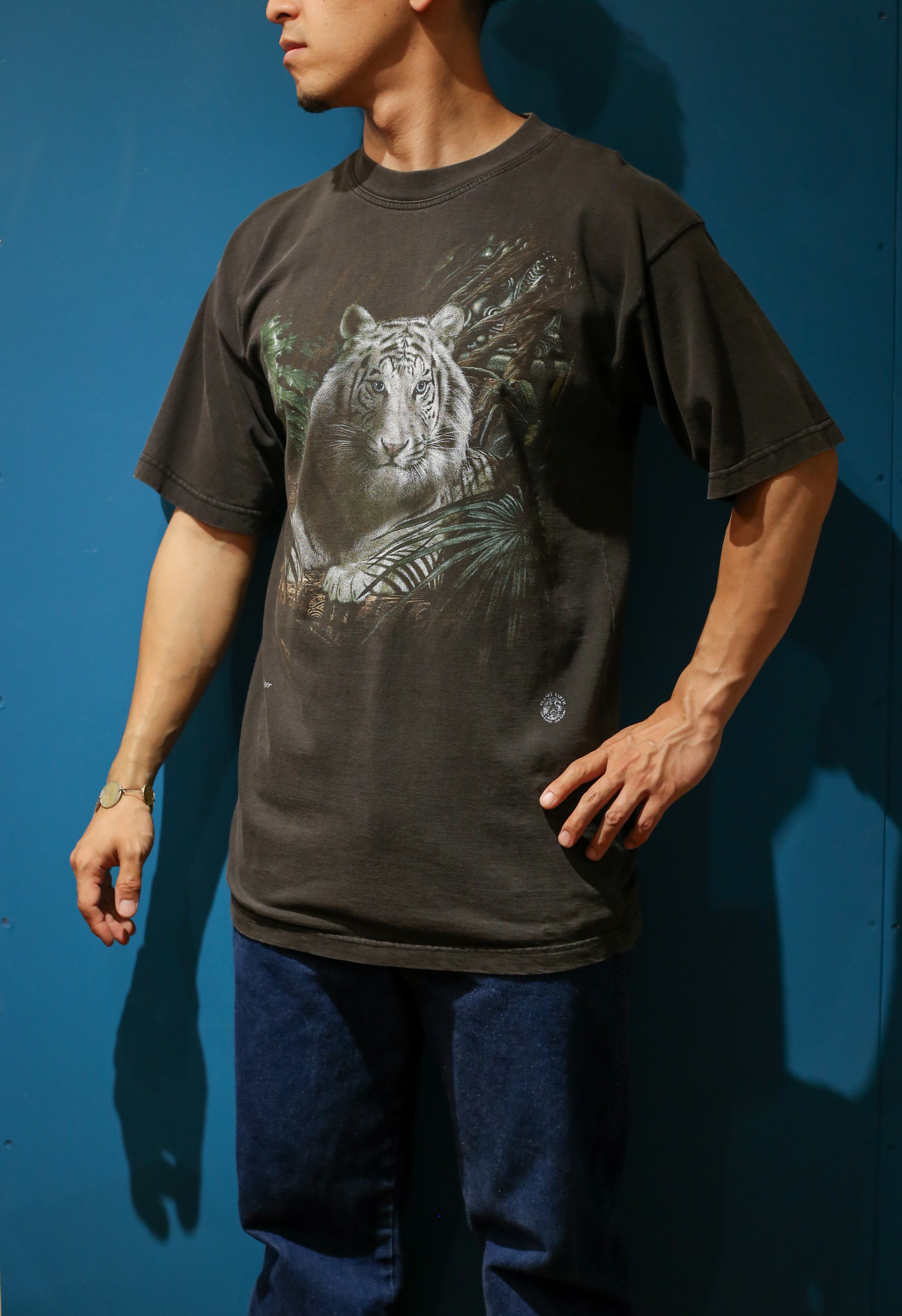 程よく色褪せた炭黒のボディに、ホワイトタイガーが落とし込まれた雰囲気抜群の、プリントTシャツ。 ホワイトタイガー好きな方、アニマル好きな方是非。 Made in Australia model : 171cm 着丈:75cm 肩幅:52cm 身幅:51cm 袖丈:22cm Fabric: cotton Size: L ※撮影環境により写真と実際の色が若干異なる場合がございます。 ※こちらの商品は古着になります。古着の特性をご了承頂いた上でご購入下さいませ。