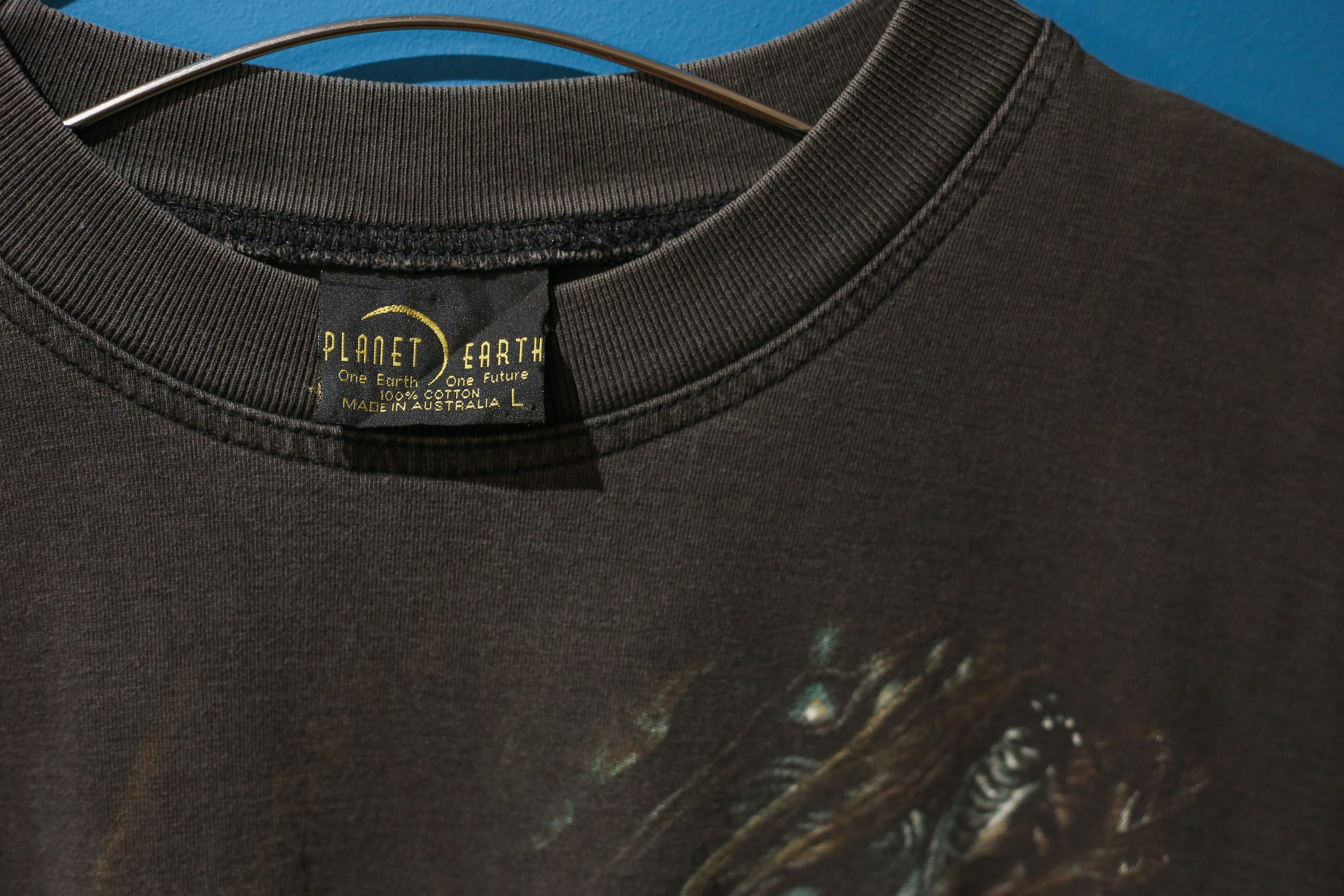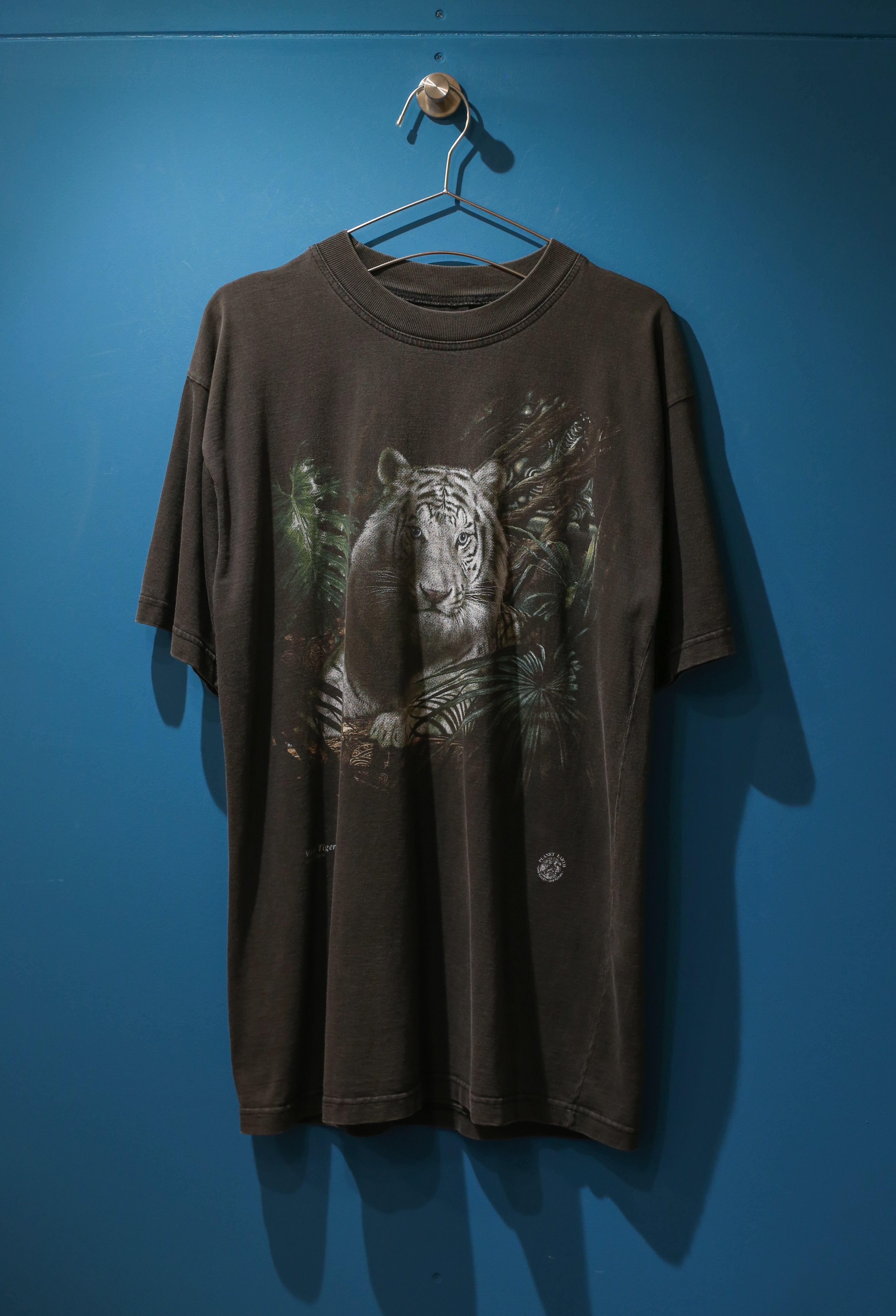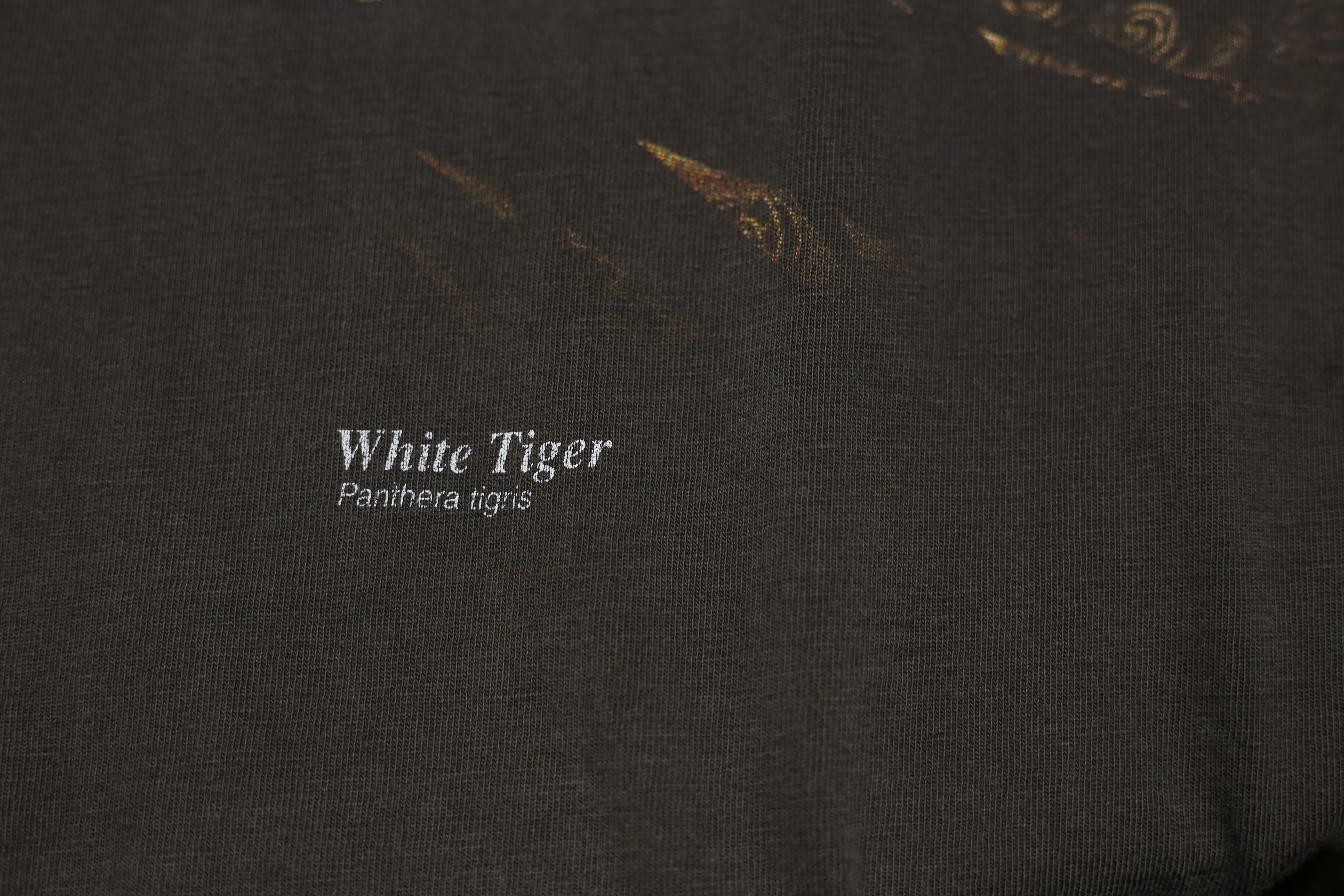 程よく色褪せた炭黒のボディに、ホワイトタイガーが落とし込まれた雰囲気抜群の、プリントTシャツ。 ホワイトタイガー好きな方、アニマル好きな方是非。 Made in Australia model : 171cm 着丈:75cm 肩幅:52cm 身幅:51cm 袖丈:22cm Fabric: cotton Size: L ※撮影環境により写真と実際の色が若干異なる場合がございます。 ※こちらの商品は古着になります。古着の特性をご了承頂いた上でご購入下さいませ。